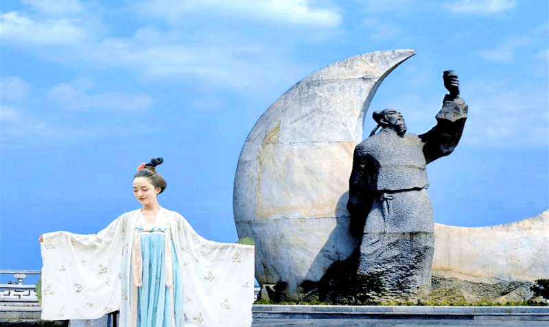 一座鲜花环绕,高约5米的雕塑,是李白与月亮的完美组合。落地弦月采用的是优质汉白玉,李白人像采用上等天然石材,整座雕塑主题明确、浪漫唯美,均为匠心打造,精雕细琢而成。呈现的是《月下独酌.其一》里“花间一壶酒,独酌无相亲。举杯邀明月,对影成三人”的诗歌意境。